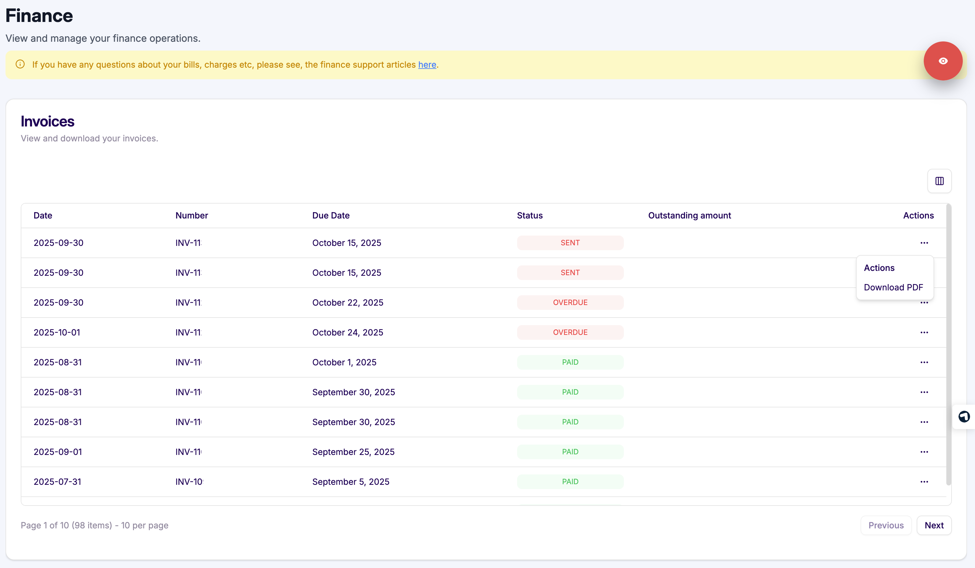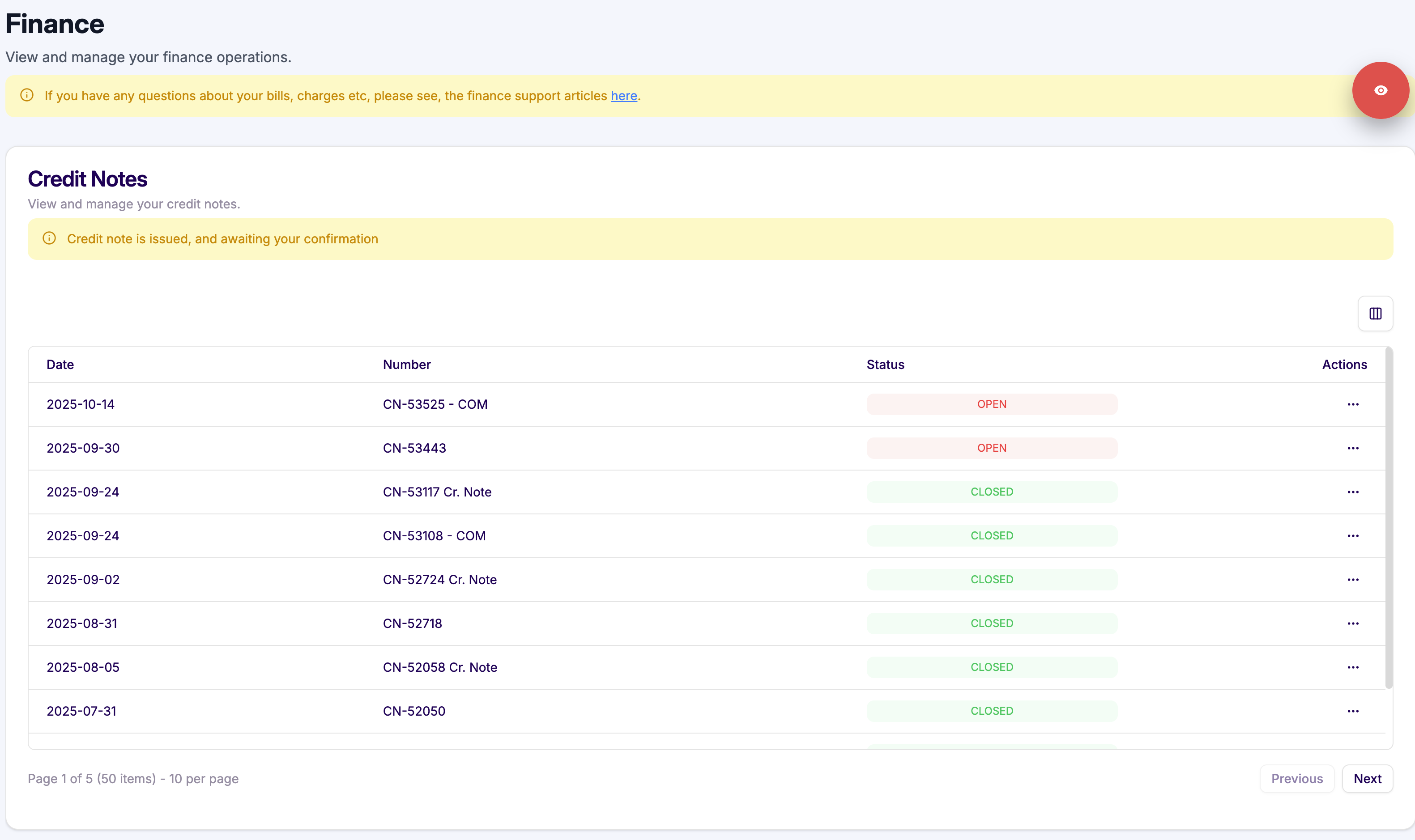 Access and manage all your financial information, including invoices, credit notes, payment methods, and bank details in one central location.