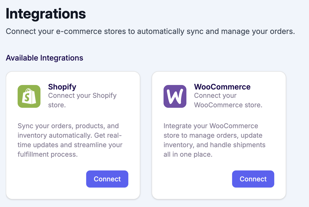 ⚠️ Important: Fulfillment clients cannot complete integration setup independently. The connector must be configured with the correct "fulfillment" service type during an integration call with our team.