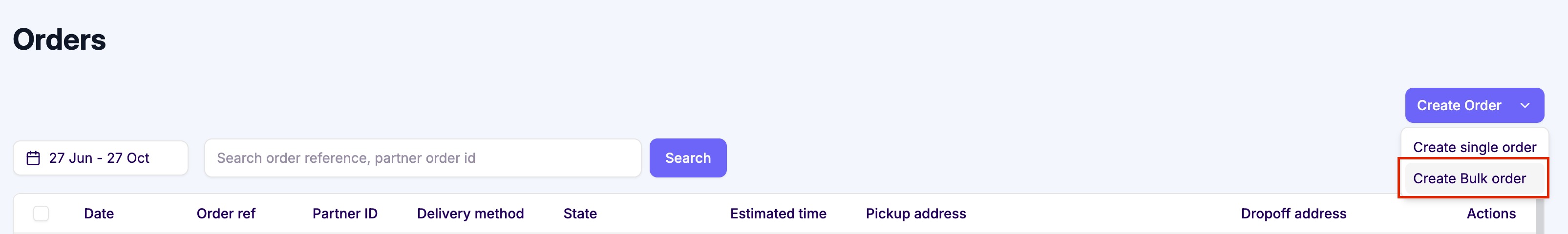 ⚠️ Important: This feature is not available for fulfillment clients as it doesn't allow for SKU selection. Bulk orders are designed for non-integrated last-mile clients who need to upload multiple delivery orders.