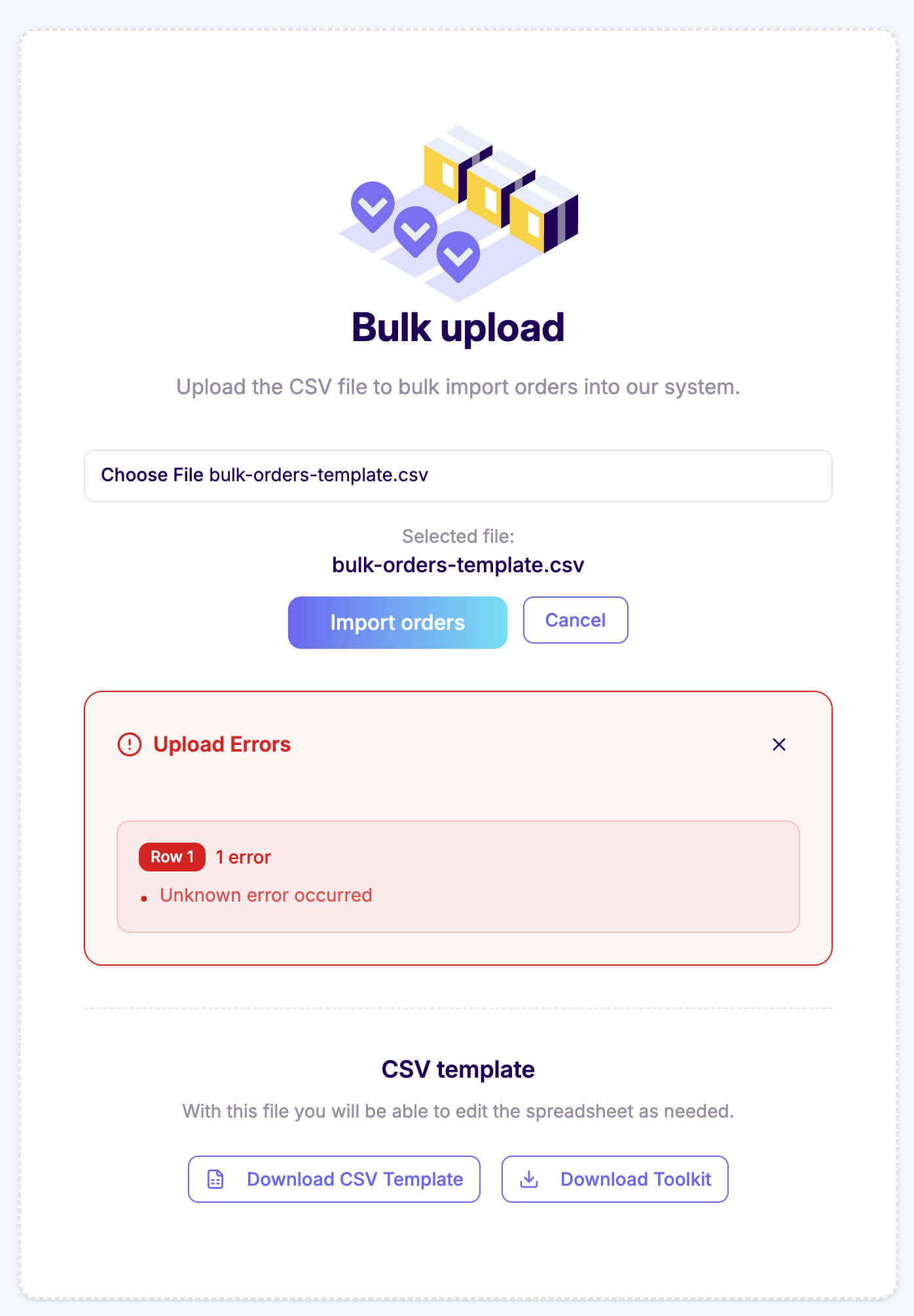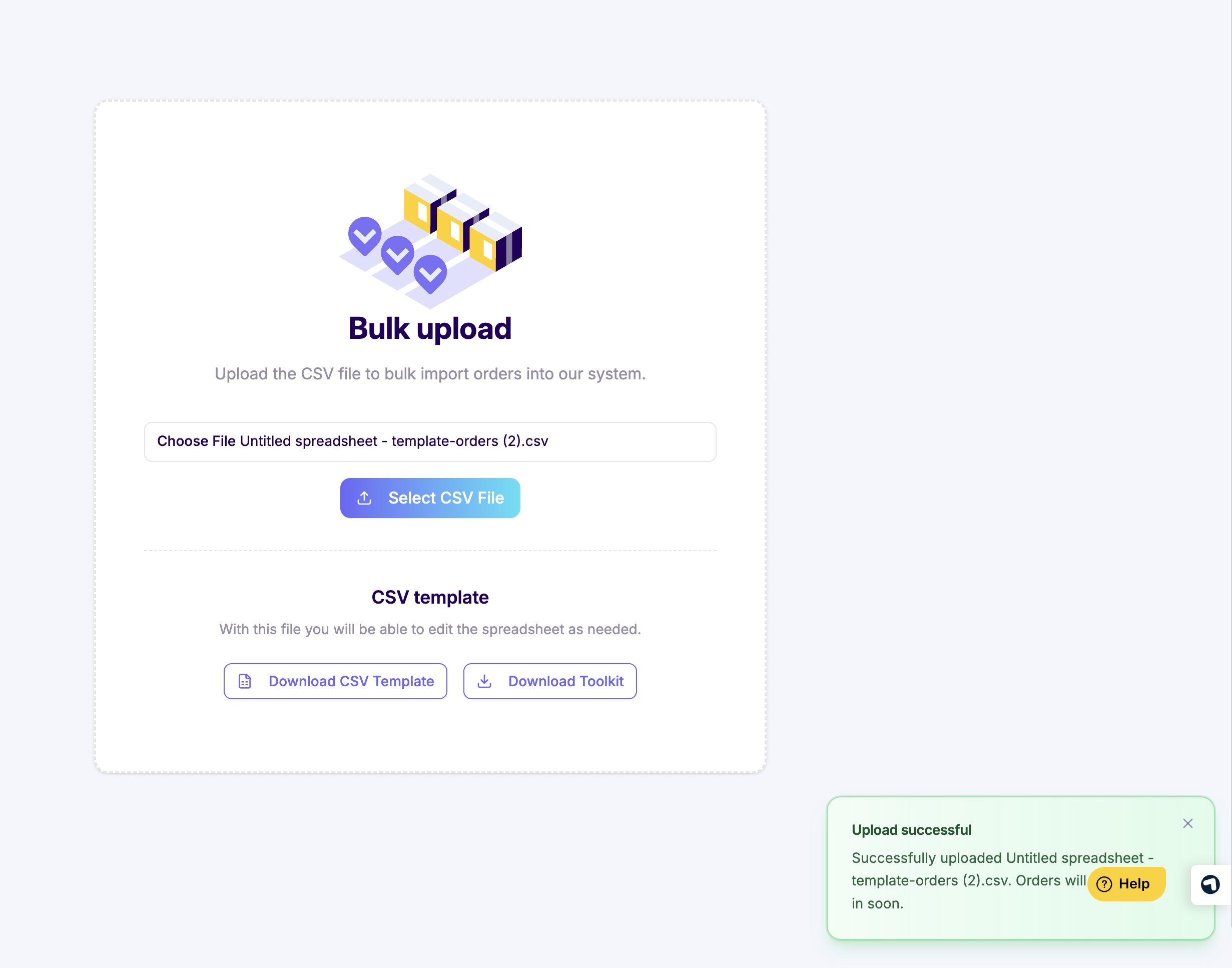 Upload multiple orders simultaneously using a CSV file to streamline your order creation process. Bulk orders save time when placing many orders at once.